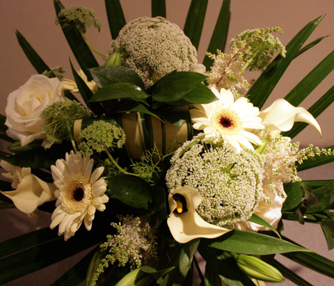 Hand tied arrangement incorporating Gerberas and Calla Lilies along with white Lilies and frothy fillers