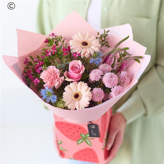 The sweetest pastel toned blooms in the cutest strawberry patterned gift box. Gorgeous fresh flowers in shades of peach, blush and lemon with pops of lilac and cerulean.