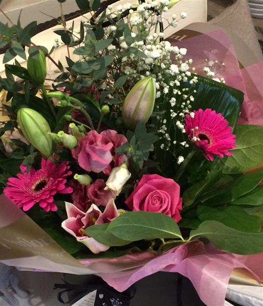 pretty pink and cerese design containing lilies, roses, lisyanthus, gysophila and germini with eucalyptus and salal foliages to complete this aqua packed bouquet