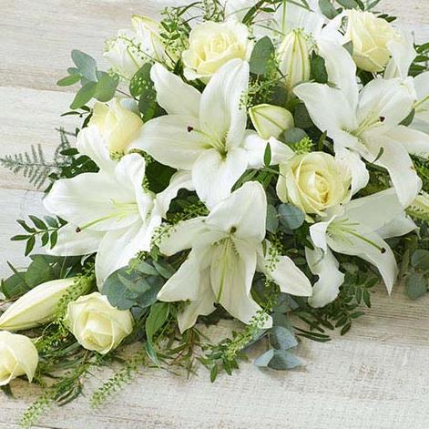 An elegant tear drop shaped arrangement featuring delicate foliage and large fragrant oriental lilies, combined with gorgeous roses.