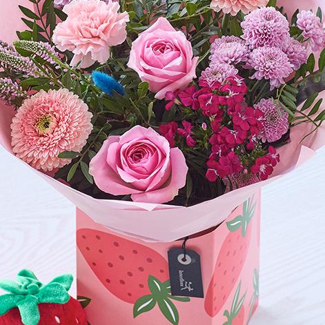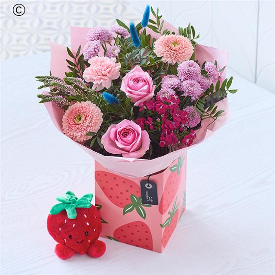 A selection of gorgeous blooms, expertly arranged by a local florist in the cutest strawberry patterned gift box. Plus the sweetest strawberry plushie toy made from recycled materials.