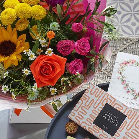 An elegant gift box filled with lush, richly coloured flowers. Expect cerise, reds, fiery orange, pops of blue or yellow plus dried flowers or foliage for texture. A bit like a vibrant summer sunset. And in case that wasn't enough they'll also get a With Love full sized greetings card, and a box of scrummy gourmet chocolates.