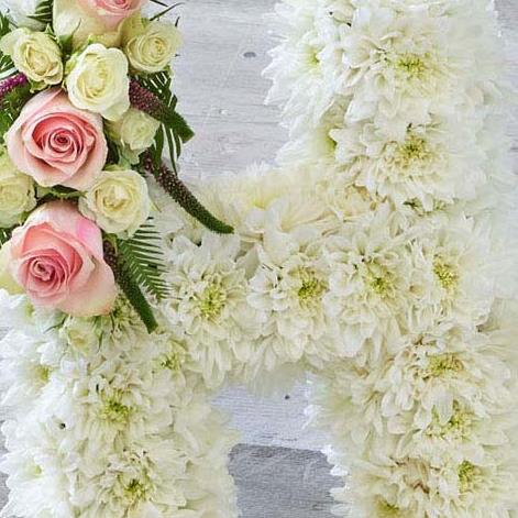 This elegant tribute is crafted using white chrysanthemums with a pink finish, a beautiful tribute to your loved one. Please select the appropriate number of letters.
